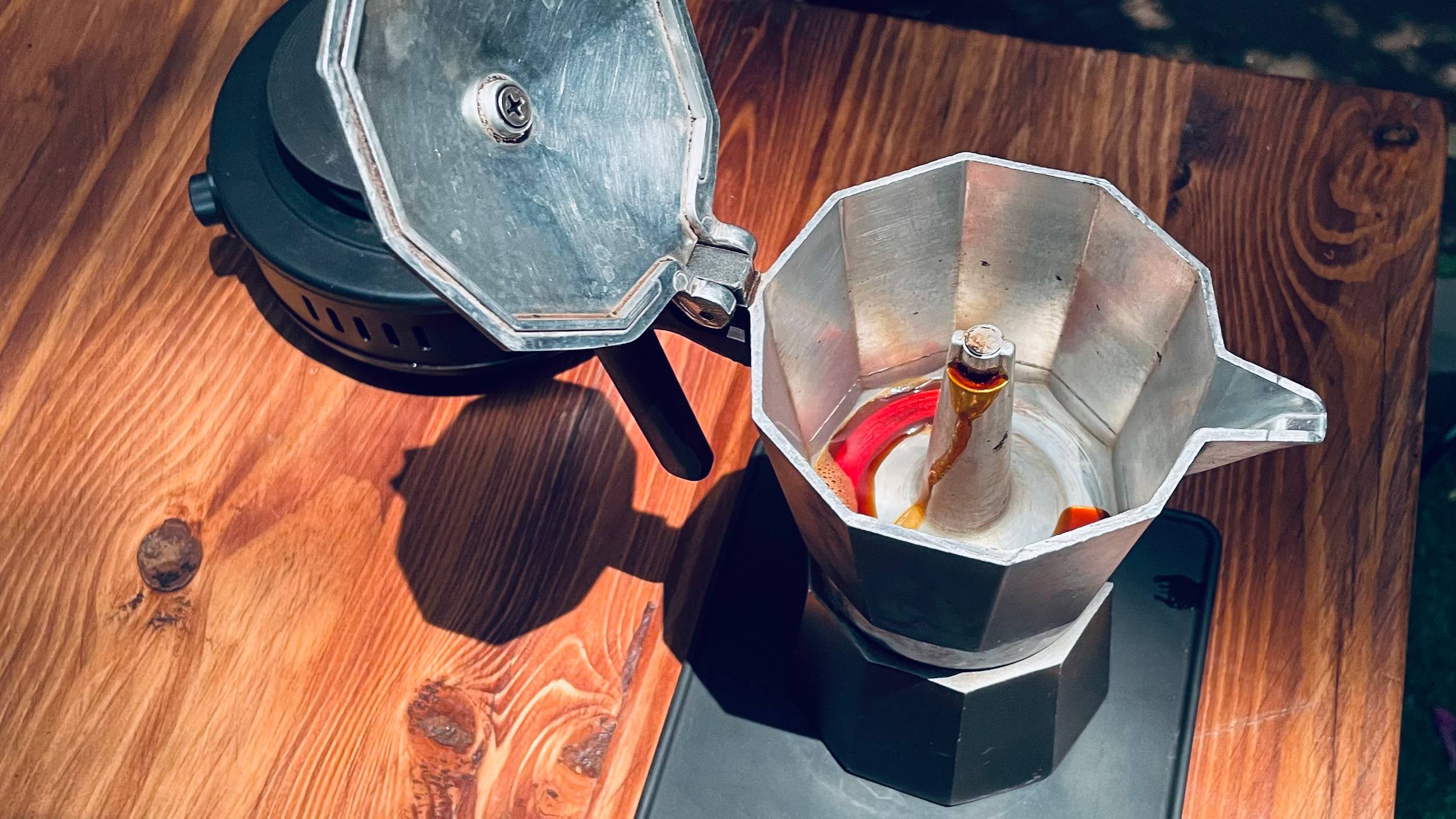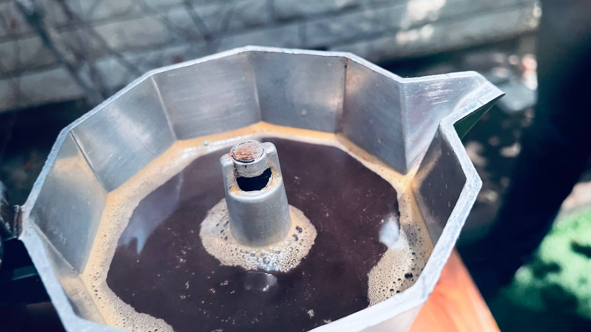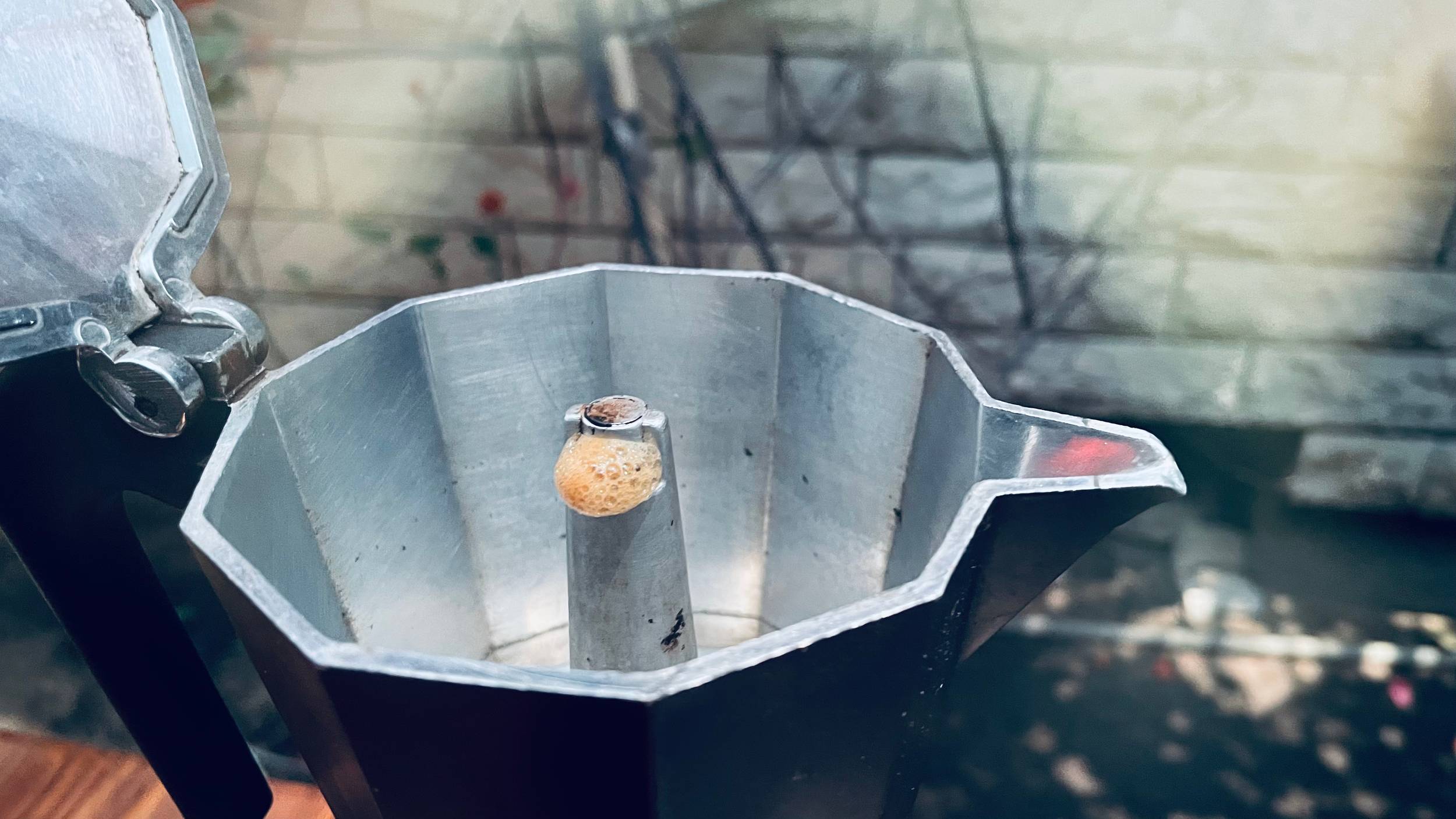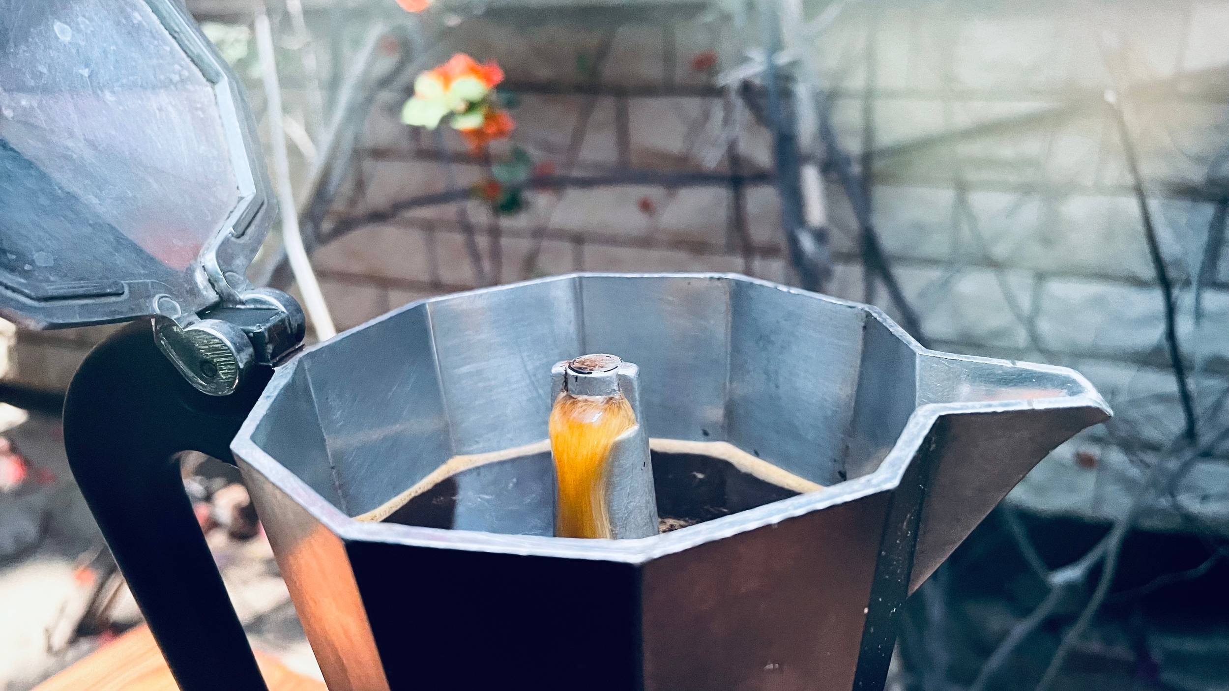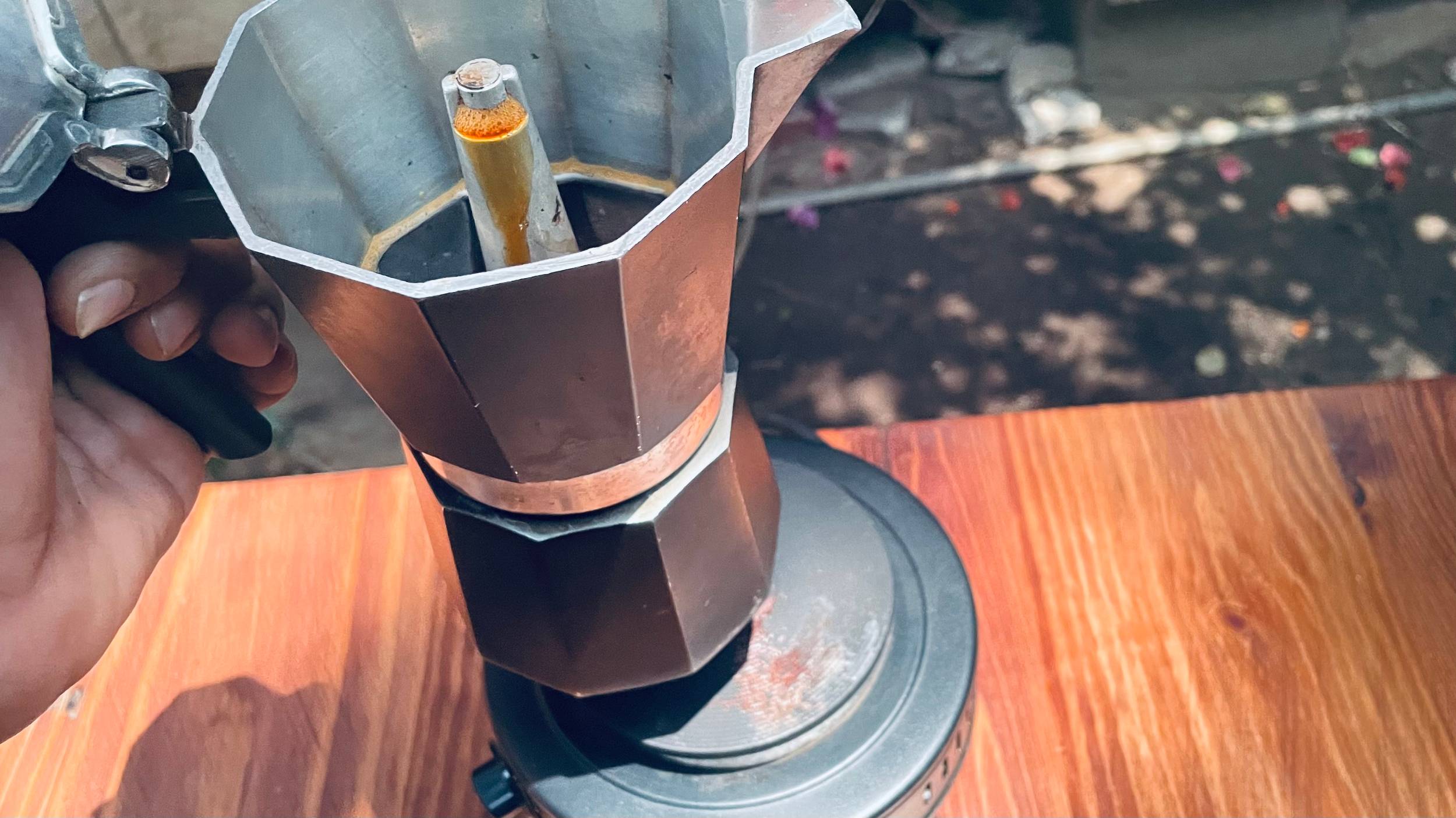 Immediatly after you see the liquid start to come out, remove the Moka pot from the heating element and let it sit around 30 sec for blooming. This stage insures all coffee grounds are saturated with water.