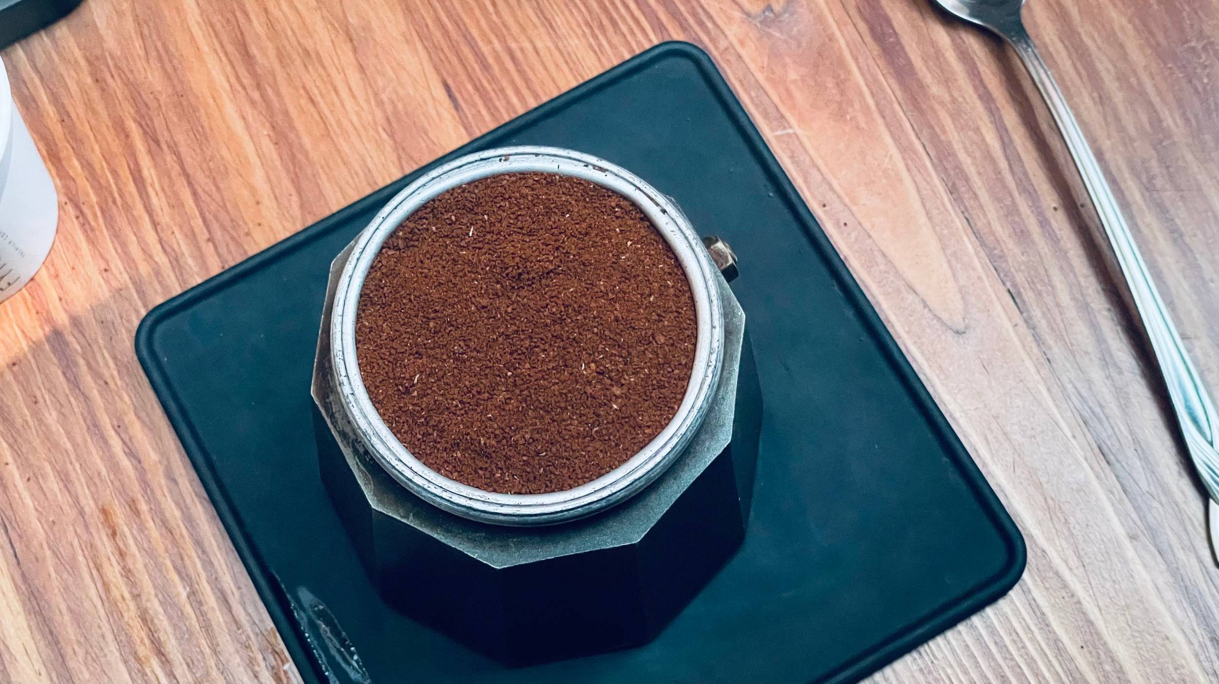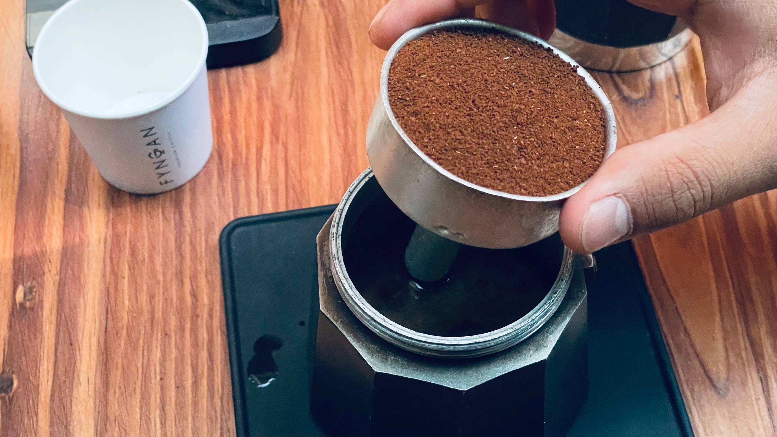 Place the moka pot basket in something that can support it while you add all the ground coffee. In our case we used our 5oz espresso take away cups.