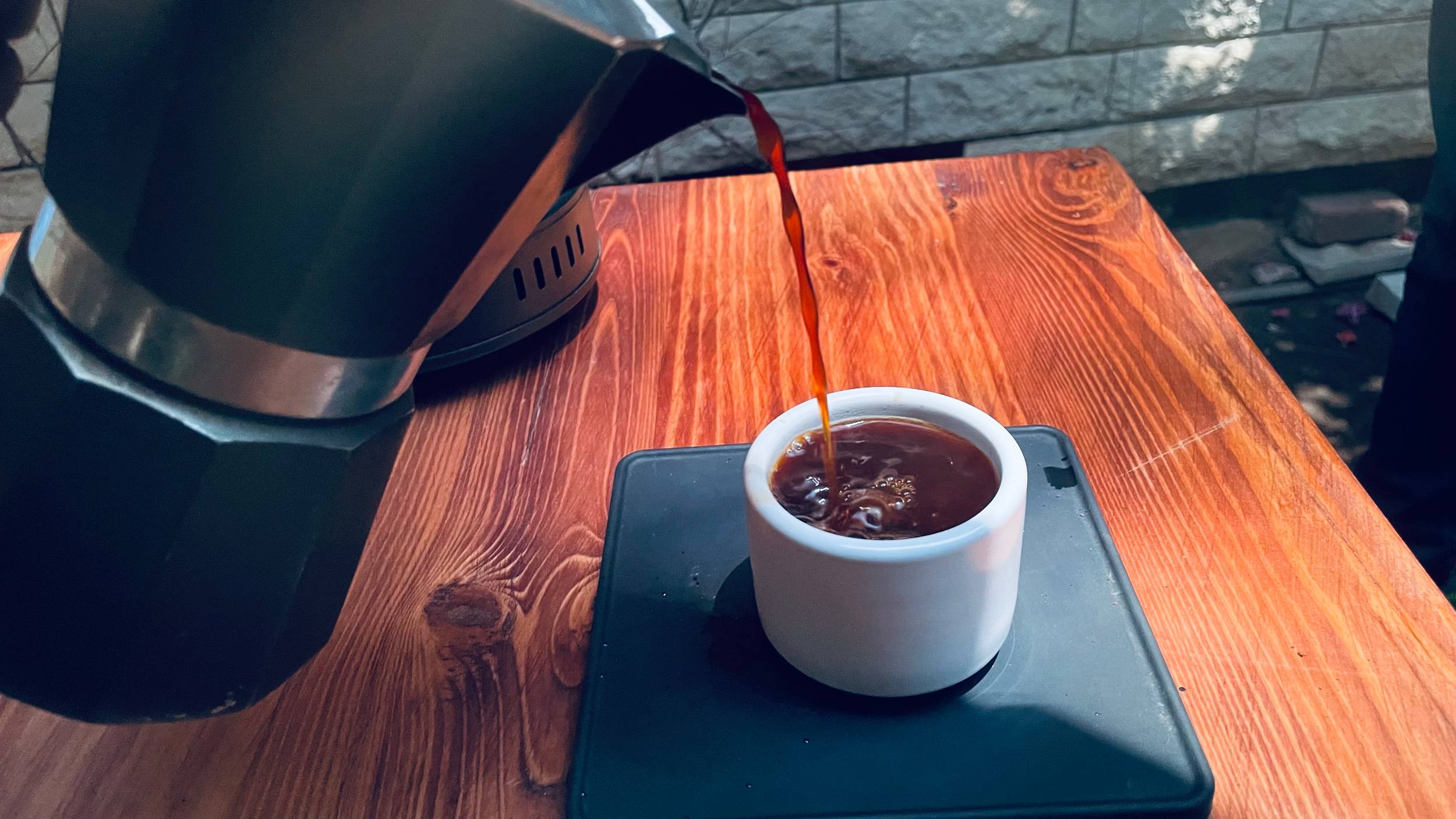 Grab your cup and pour your deliciously brewed Moka Pot drink.